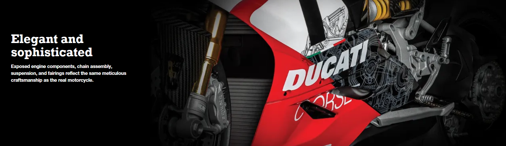 Comprising over 700 precisely engineered parts, this detailed kit reflects the artistry and vision behind Ducati’s final V2 engine. From the finely detailed engine and racing chassis to the multi-textured fairings and authentic suspension, every element is crafted using premium materials. Functional features like steerable handlebars, moving suspension, and working chain provide a tangible sense of the motorcycle’s engineering precision.