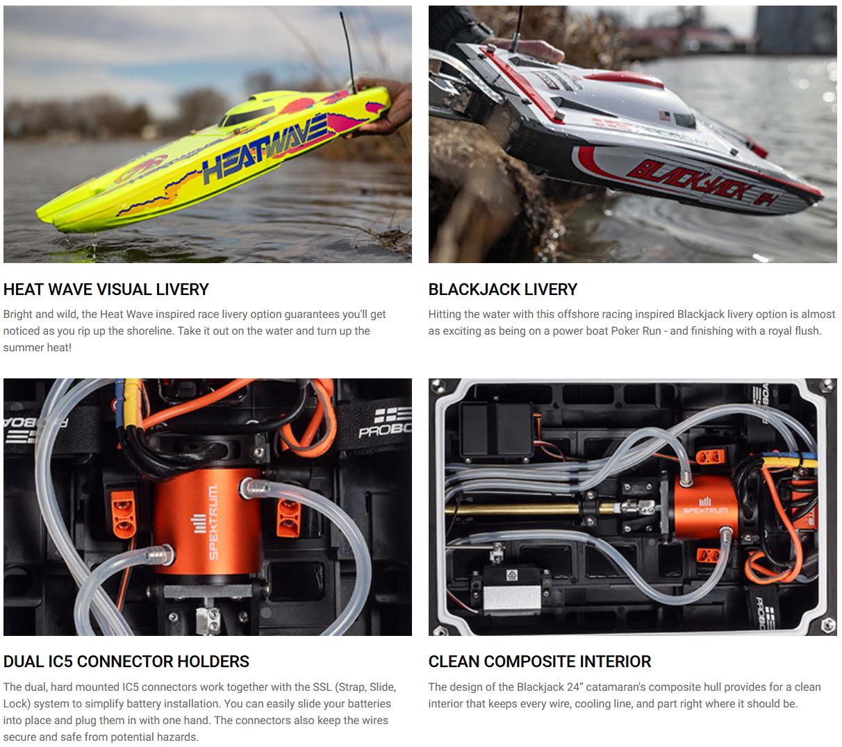 Pro Boat gives you a choice of two iconic liveries for your Blackjack 24” catamaran. At top speed, the Heat Wave race livery is a blaze of wild color burning through the water. With the Blackjack offshore racing livery option, you'll feel like you're winning all of the aces in a power boat Poker Run.