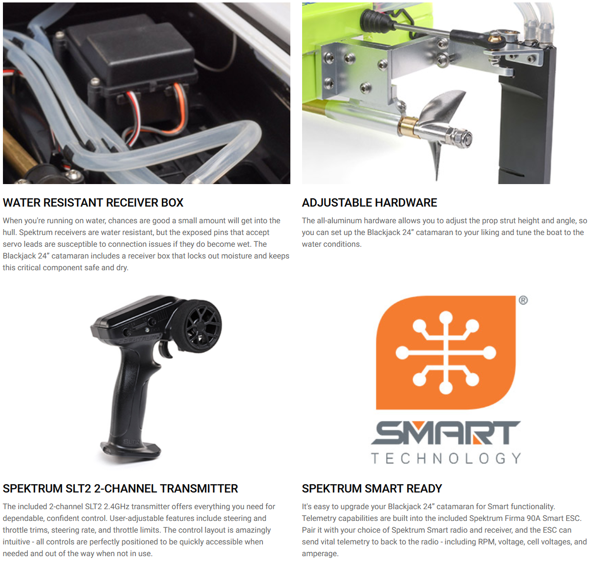 With its brushless power, Spektrum electronics, and forgiving catamaran hull, the Blackjack 24” makes a great boat for everyone from first-timers to experienced modelers. If you're already a fan of the Blackjack 42”, add this one to your collection and enjoy the same performance on lakes and ponds of almost any size, large or small.