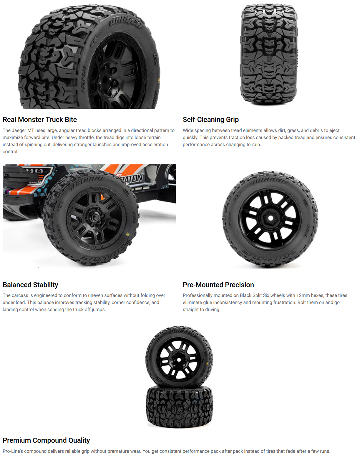 As with all Pro-Line tires, the Jaeger MT tires are proudly Made in the USA and engineered to deliver the performance and durability bashers expect.