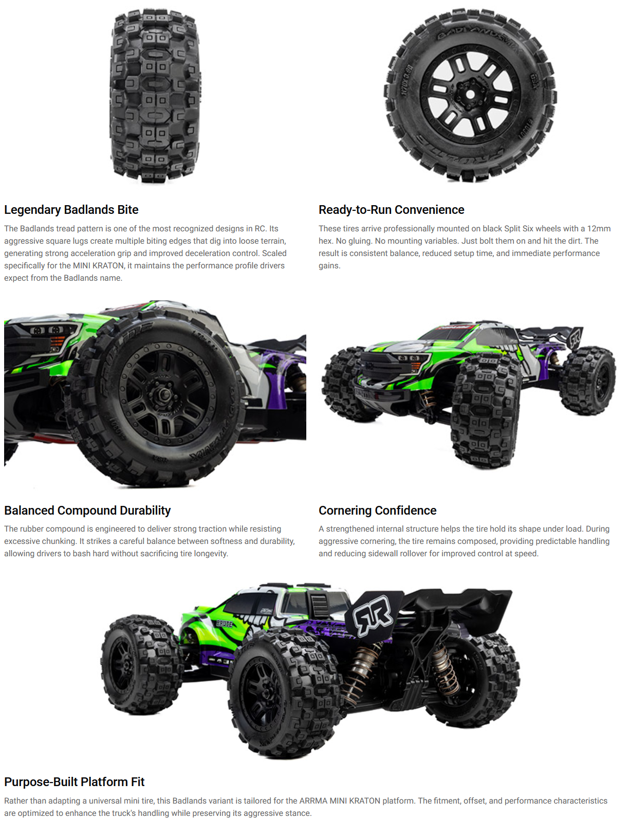 - Proven Badlands tread pattern scaled specifically for the ARRMA MINI KRATON