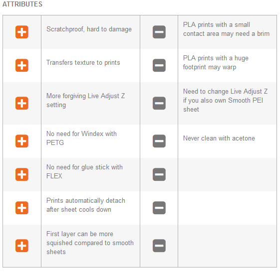 I'm very happy with this print surface for my Prusa. The surface texture it leaves on the parts is awesome and once you apply a little glue stick bed adhesion is good.