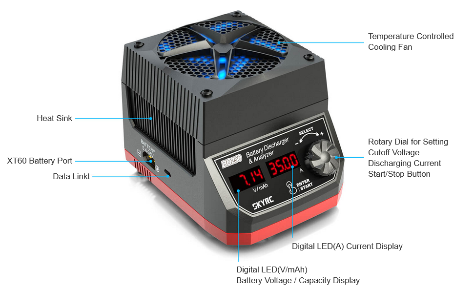 This is SKYRC BD250 Battery Discharger Analyzer. Upgraded from BD200, BD250 is not only a powerful discharging device but also a precise measurement tool for battery capacity. It takes the guesswork out of choosing the good-performance battery for your application. BD250 offers a maximum of 250 Watts/35 Amps to discharge your battery and will test virtually any battery type or size, any chemistry cells. It's stylish but small with a high-performance cooling system and uses MOSFETS from the well-known IXYS, to make sure it can discharge at 250 watts continuously.