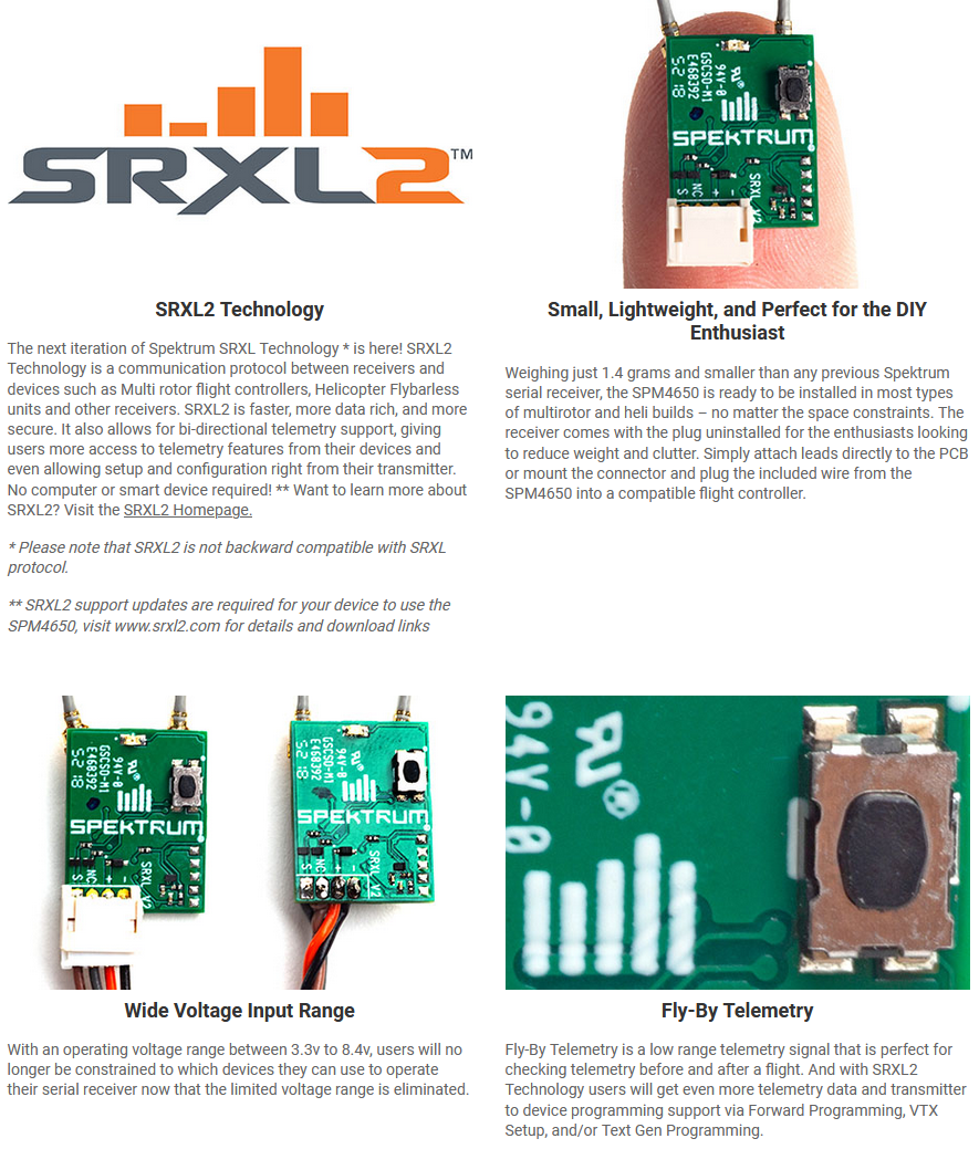 The SPM4650 DSMX SRXL2 Serial Micro Receiver takes the original SPM4648 receiver and adds more value, functionality and fly-by telemetry, while decreasing the size and weight of the already micro sized Spektrum serial receiver. The SPM4650 uses our feature-rich SRXL2 protocol to give pilots a blazing fast serial data connection with up to 20 channels. SRXL2 is a powerful communication protocol that improves bi-directional communication between the radio system and flight controller for added telemetry functionality and flight control configuration right from the pilots Spektrum Transmitter*, all over one signal wire.