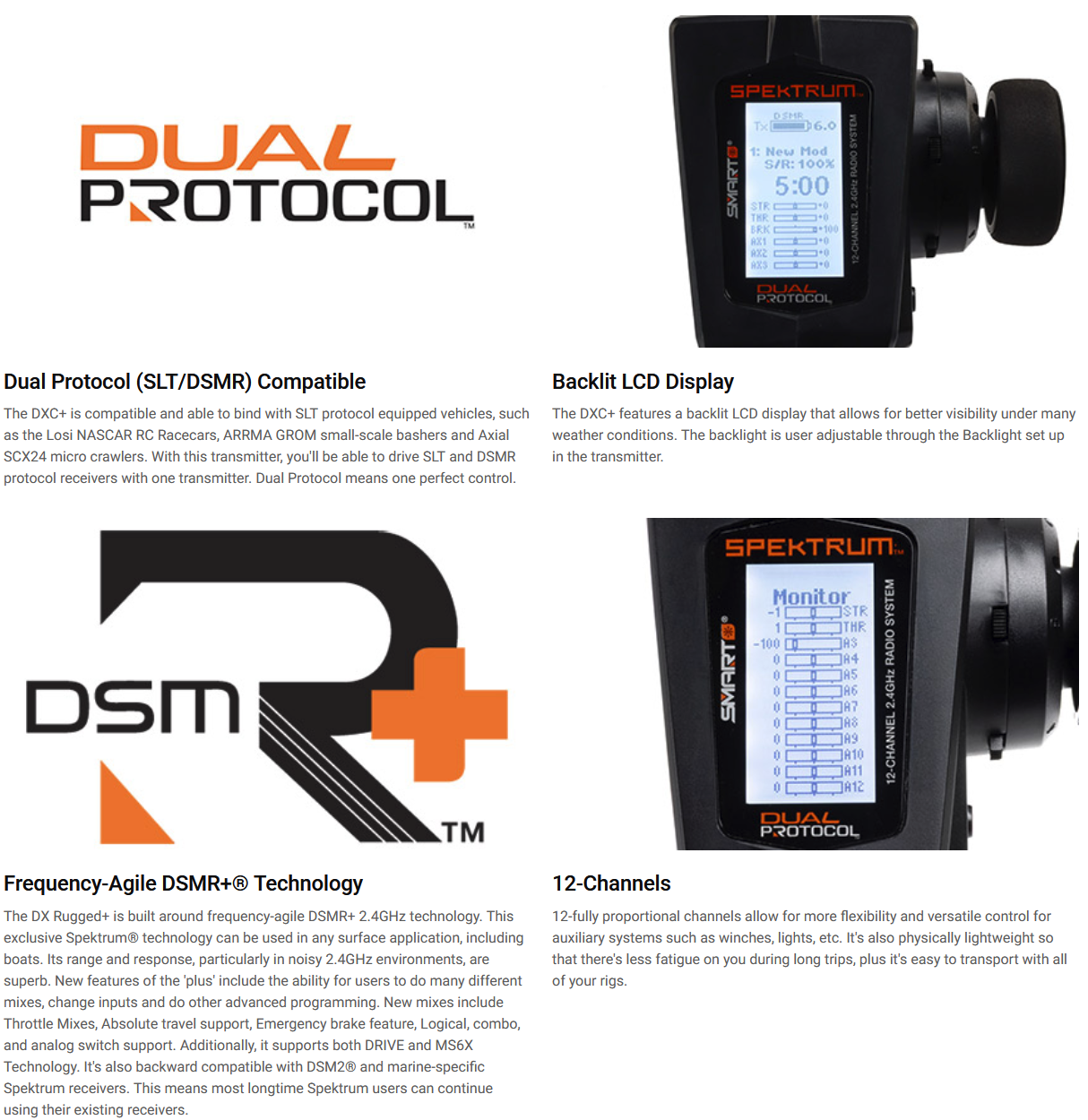 The DXC+ is the savvy solution for bashers, boaters and scalers who want a staggering list of advanced features that includes the virtually unlimited possibilities 12-channel control offers. Built around frequency agile, DSMR+® 2.4GHz technology, you can use the DXC+ in any type of surface application, including boats. Its range and response, particularly in noisy 2.4GHz environments, are superb.