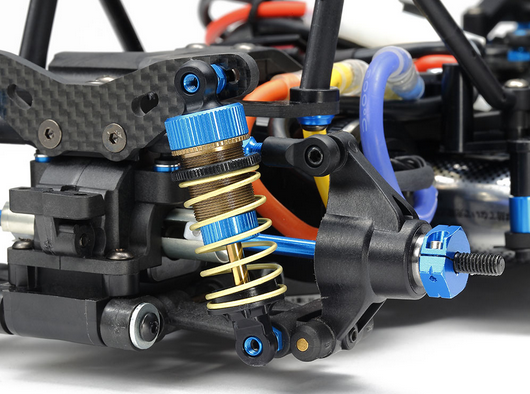 High performance M-chassis aluminum big bore dampers+ are included, and feature blue anodized top and bottom caps for a classy look.