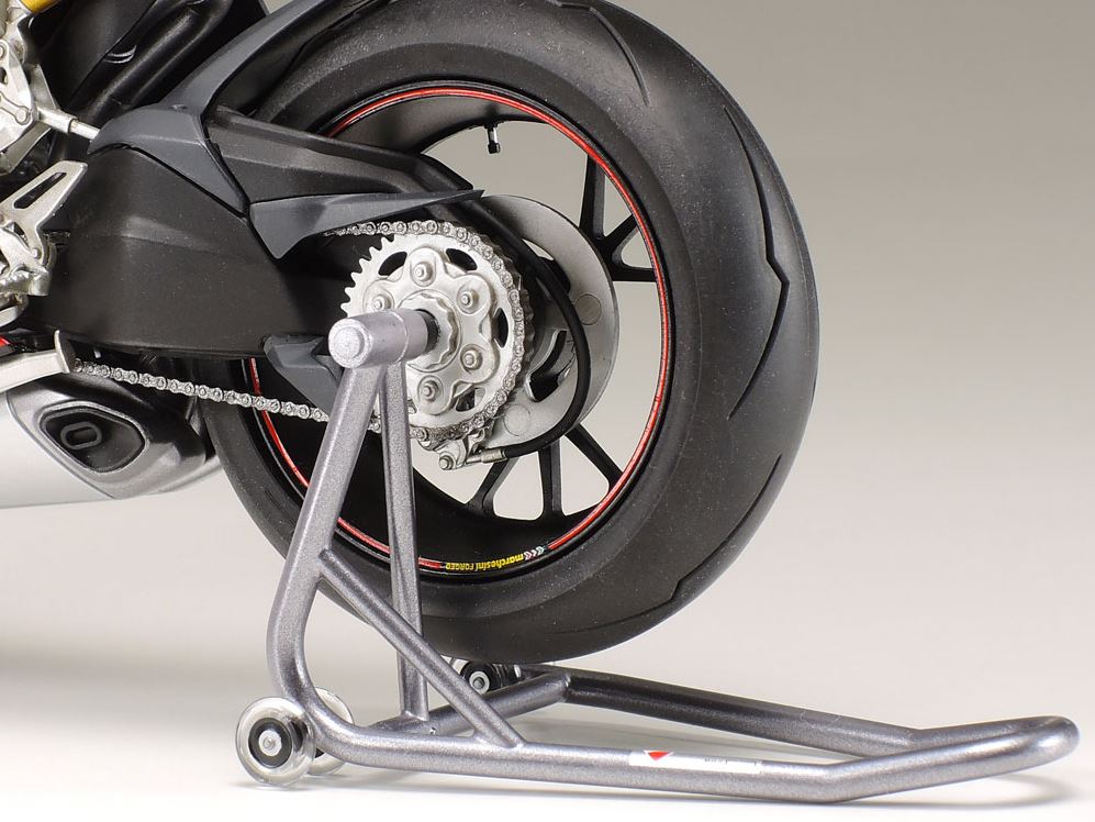 L-Twin engine and its surroundings accurately reproduced. Note the damper unit on the bike's left side.