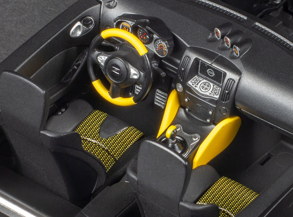 Decals recreate yellow seat stitching and logos in the black interior. Parts are included for a choice of left- or right-hand drive model.