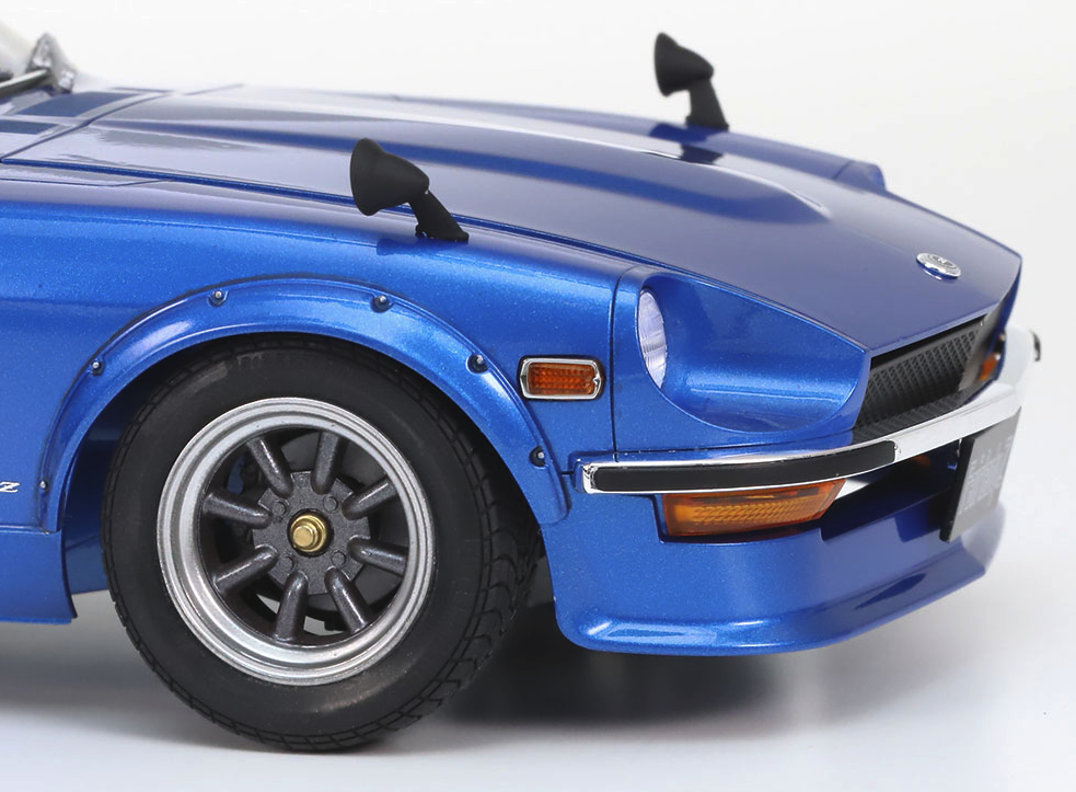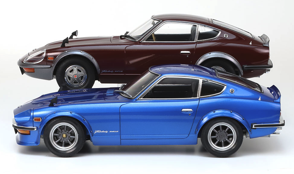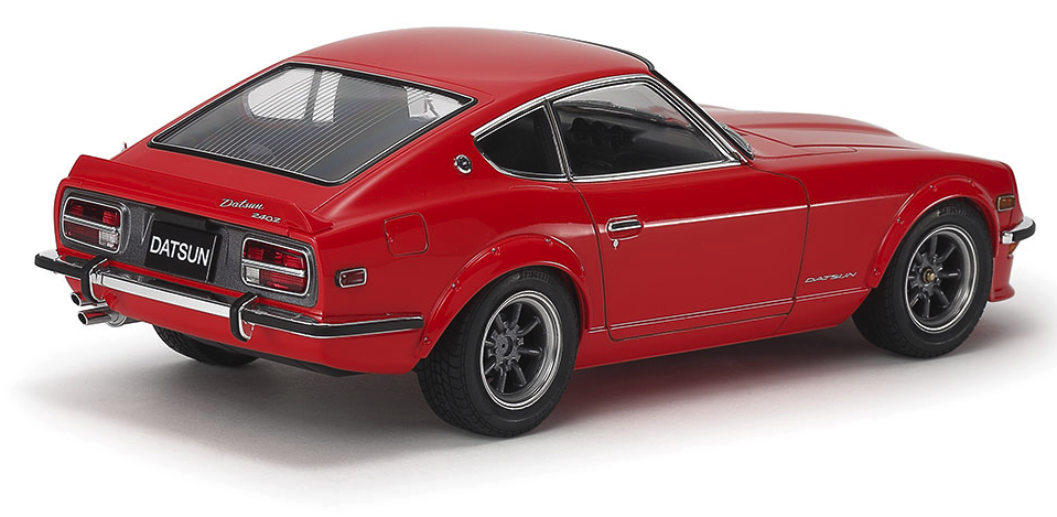 The ageless 240Z form is captured in style, and the model can be assembled as a left-hand drive North American version, with a red body in images on this page. (The model with a blue body is the Japanese right-hand drive version.)