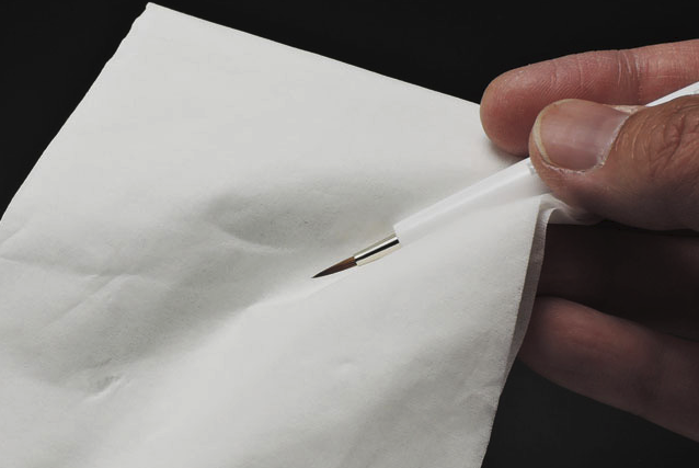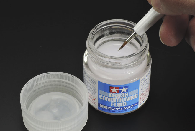 Clean brush using appropriate thinner and allow to dry completely. Then, apply fluid to brush, ensuring it fully reaches all bristles.