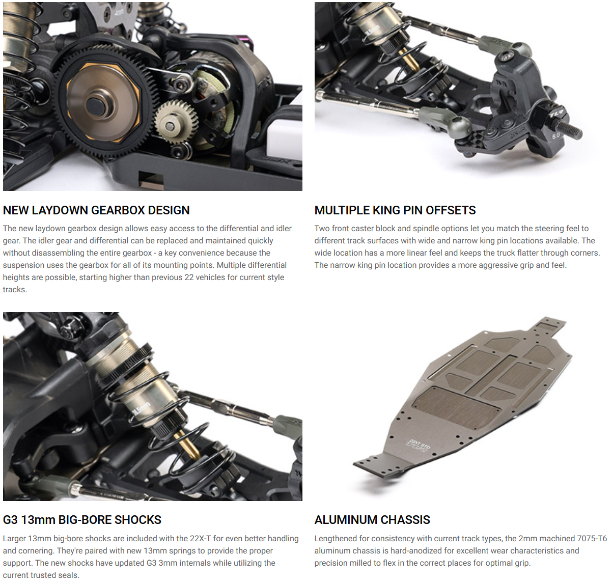 If you're ready for the podium, the 22X-T is equipped to take you there. Key improvements include a hard-anodized 2mm 7075-T6 aluminum chassis that's lengthened and optimized for today's higher grip tracks, plus adjustable body mounts and all-new front and rear arms. The buggy-length shocks and lower towers produce a lower CG, while larger, 13mm big-bore shocks with 13mm springs contribute to plush landings and quick cornering.