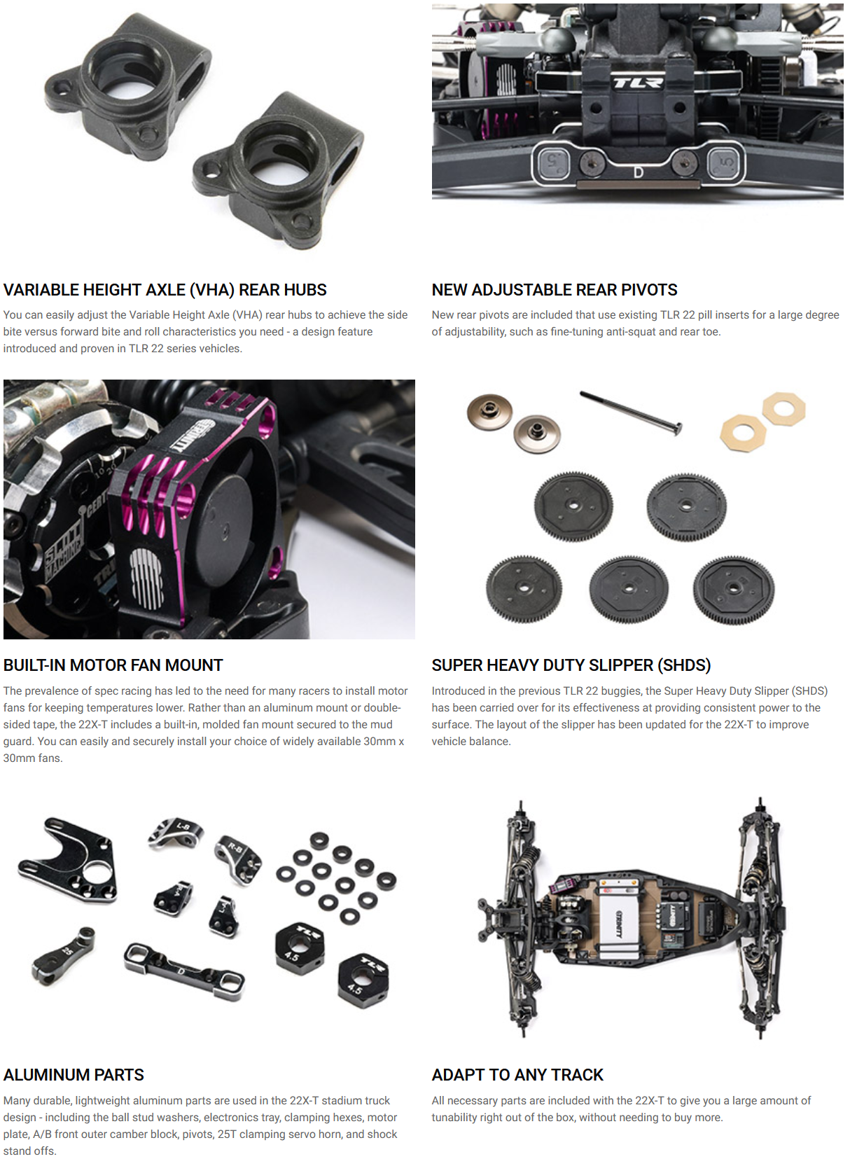TLR includes many option items with the 22X-T to offer the maximum amount of tunability right out of the box. It also has many parts in common with the 22X DC and 22X AC Race Buggy Kits for easy parts sharing. The demands of 2WD electric racing have changed, as the tracks have changed from traditional loose-grip dirt to high-grip clay, carpet, and turf. With the 22X-T, you can adapt to any track and be fast and successful anywhere.