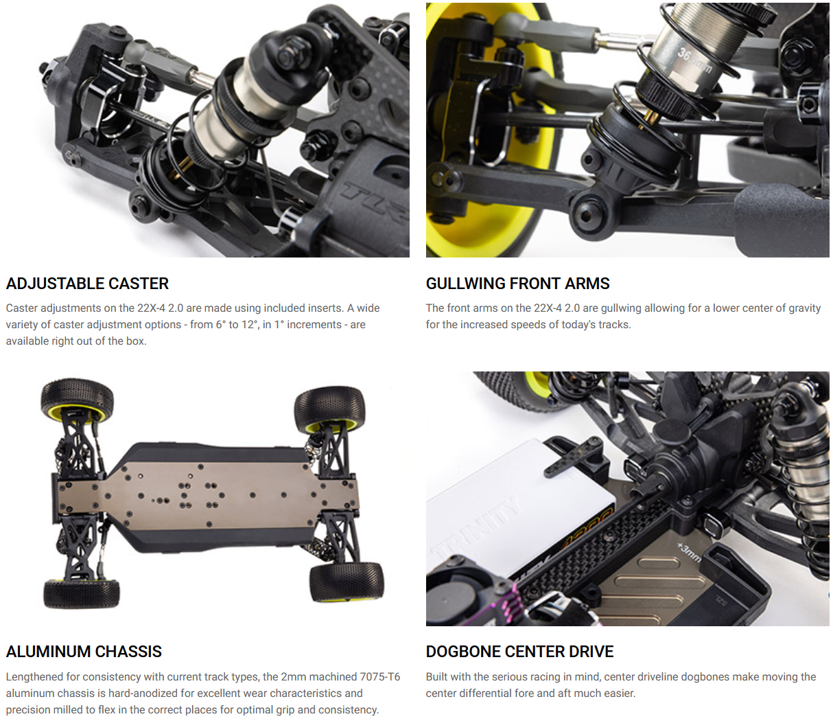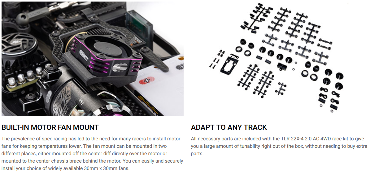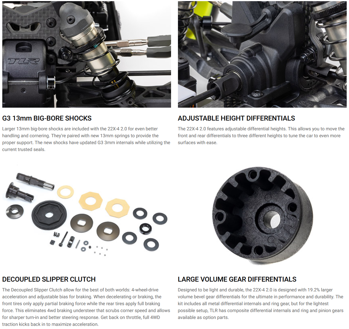 TLR takes the lessons of its revolutionary 22 series and launches the next era of electric racing dominance with the 22X-4 2.0 AC 4WD kit — next generation design with more adjustability for higher speed capabilities on today’s high-grip astro and carpet surfaces.