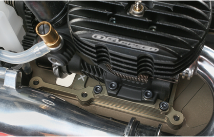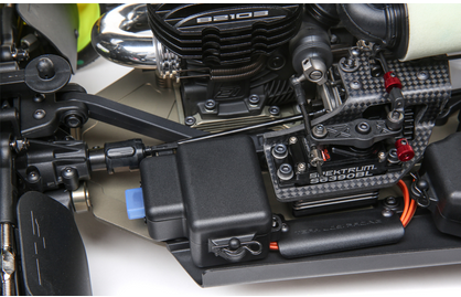 An updated radio tray now puts the throttle servo near the engine to eliminate additional linkage. The updated radio tray will ensure the throttle servo is rigidly mounted to avoid any flex by floating the servo off of the center differential.